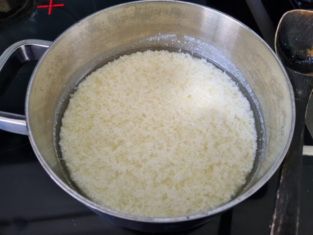 Naarmate het geheel kookte, klonterden de brokken en werden vaster. Na een paar minuten koken heb ik een snufje zout toegevoegd.