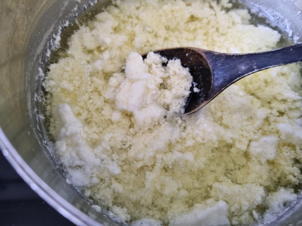 Je giet de melk in een pan en laat de melk langzaam opwarmen. In mijn geval was de melk al brokkerig geworden.
