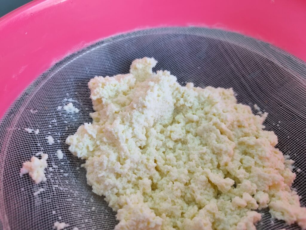 Daarna de boel door een zeef gehaald. Je kunt de kaas ook door een biologische katoenen groeten- en fruitzak halen en overtollig water uitknijpen. Voor mij was de zeef genoeg. Ook omdat het om een kleine hoeveelheid ging.