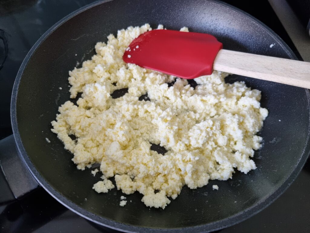 Wat je krijgt is een zelfgemaakte lichtzure kaas die heerlijk is te gebruiken met ei (vervang de melk met deze kaas voor een variatie op scrambled eggs met wat chillivlokken en zwarte sesam voor een bite zoals hieronder), een oven- of pastaschotel of als vulling voor een pastei van bladerdeeg.